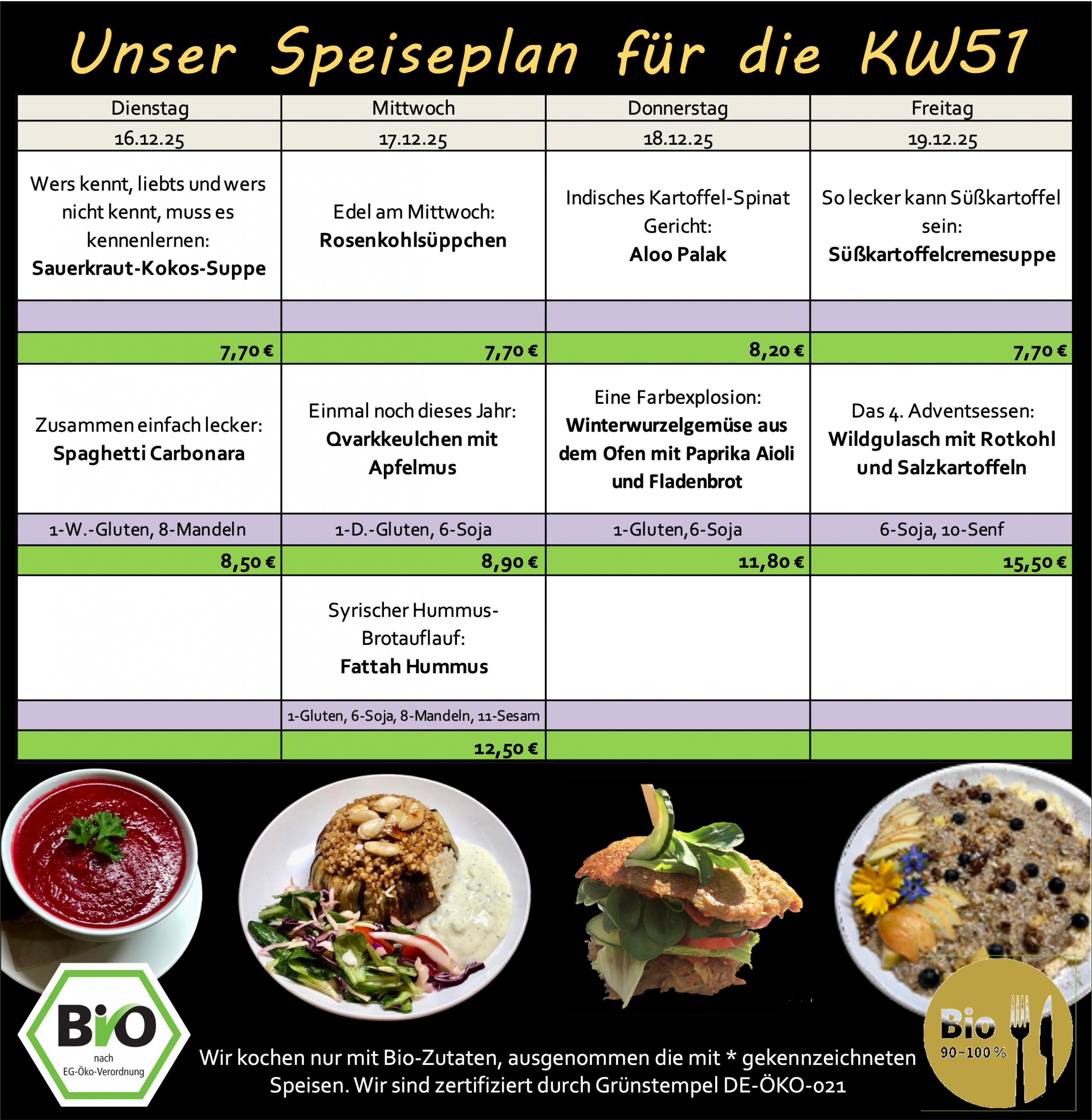 Unsere Gerichte kochen wir ausschließlich selbst – wir verwenden also keine Fertiggerichte. 99% der Zutaten sind aus BIO- oder DEMETER-Zertifizierten Anbau.